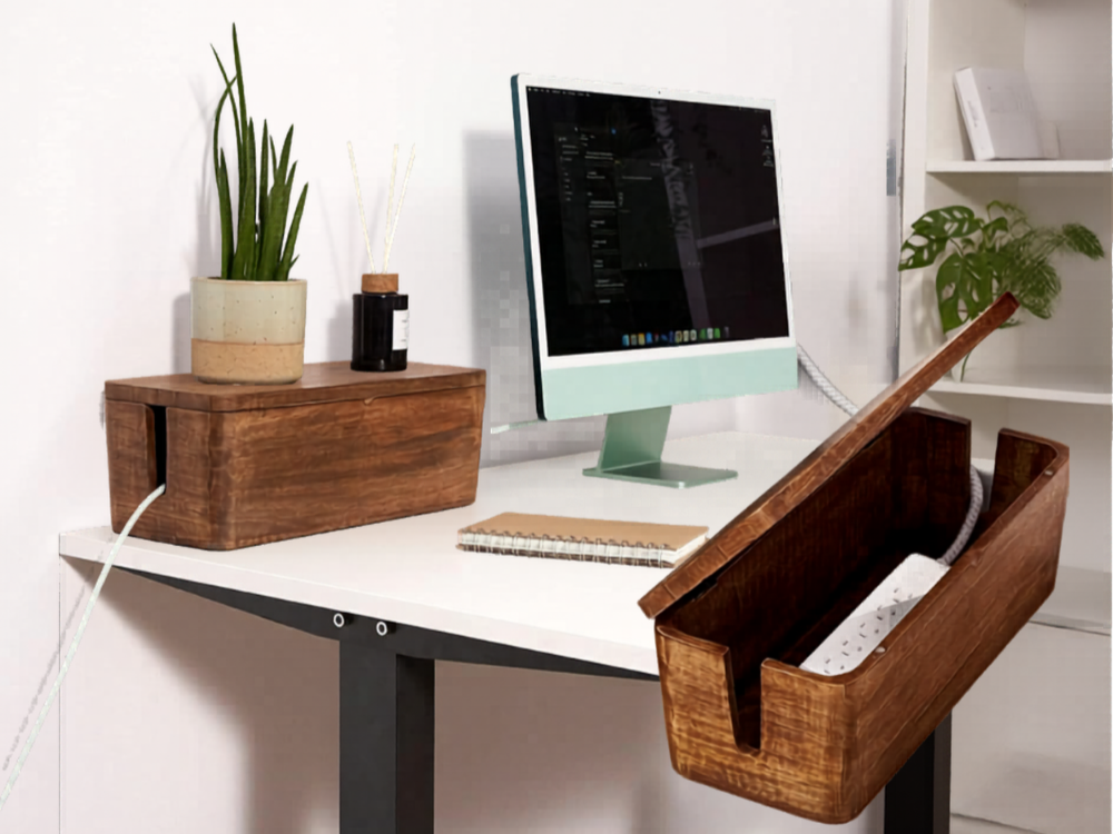 A cable management box that contains a power strip and routes cords cleanly — a small organizational fix that changes how a desk feels more than its simplicity suggests.